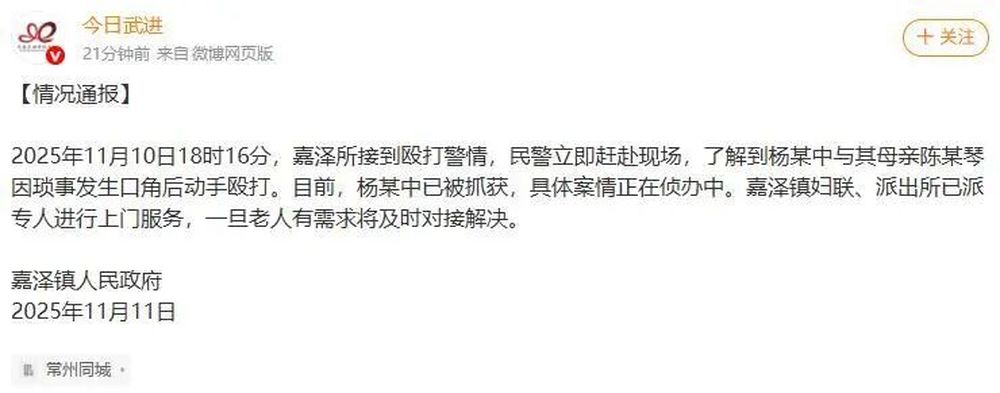 11日下午,武进区嘉泽镇人民政府通报:2025年11月10日18时16分,嘉泽所接到殴打警情,民警立即赶赴现场,了解到杨某中与其母亲陈某琴因琐事发生口角后动手殴打。目前,杨某中已被抓获,具体案情正在侦办中。嘉泽镇妇联、派出所已派专人进行上门服务,一旦老人有需求将及时对接解决。