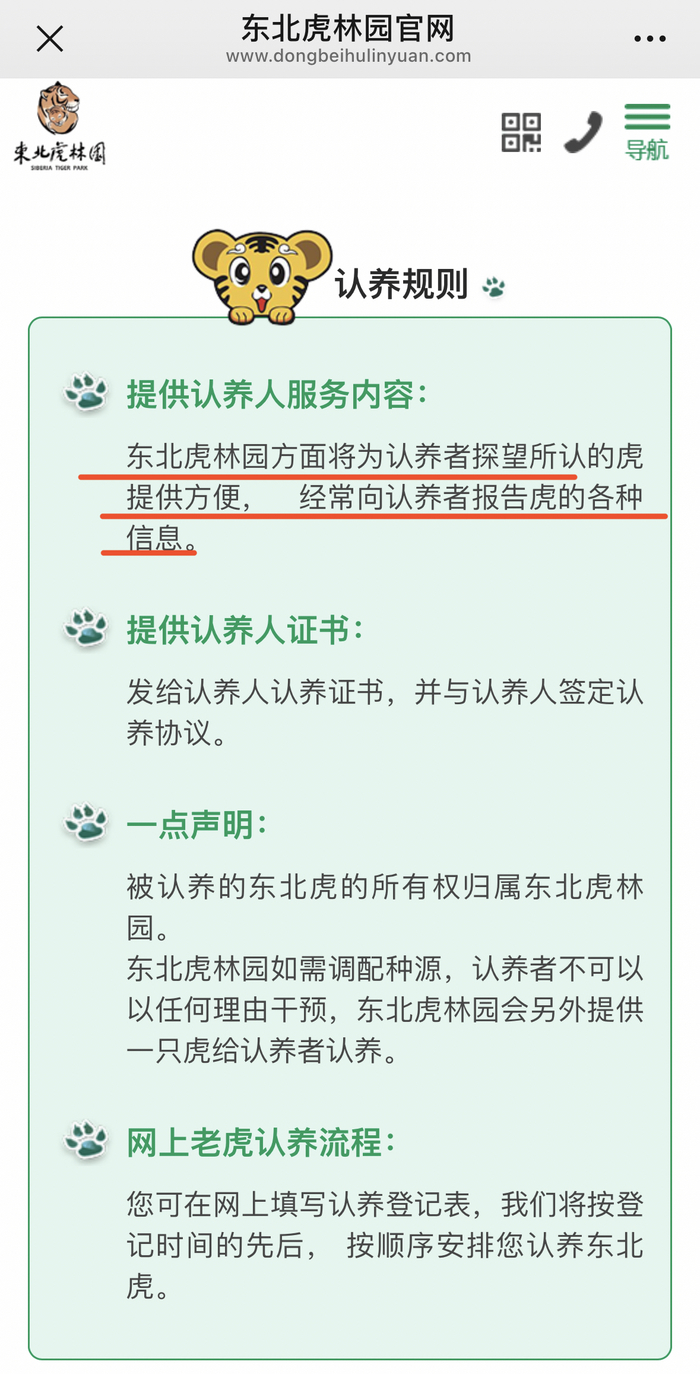 记者登录黑龙江东北虎林园官方网站查询,其认养项目页面仍标注着“定期反馈生活情况”“免费入园”“认养证书”等服务承诺,也未提及认养资金使用公示的内容。