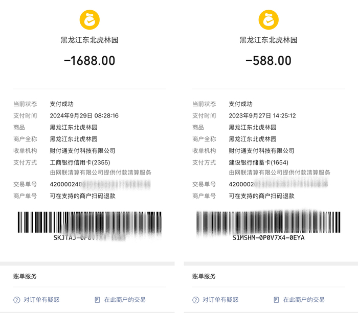 “不同认养费可获得对应的权益,包括认养证书、专属认养身份证、随机纪念品,以及每年2次(588元/年)或6次(1688元/年)的免费入园机会。”李女士随后在两年时间里,先后缴纳了588元和1688元,收款方均为黑龙江东北虎林园,“认养期间,虎林园只给我一张认养证书,并未签订任何认养协议。”