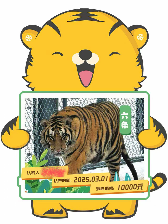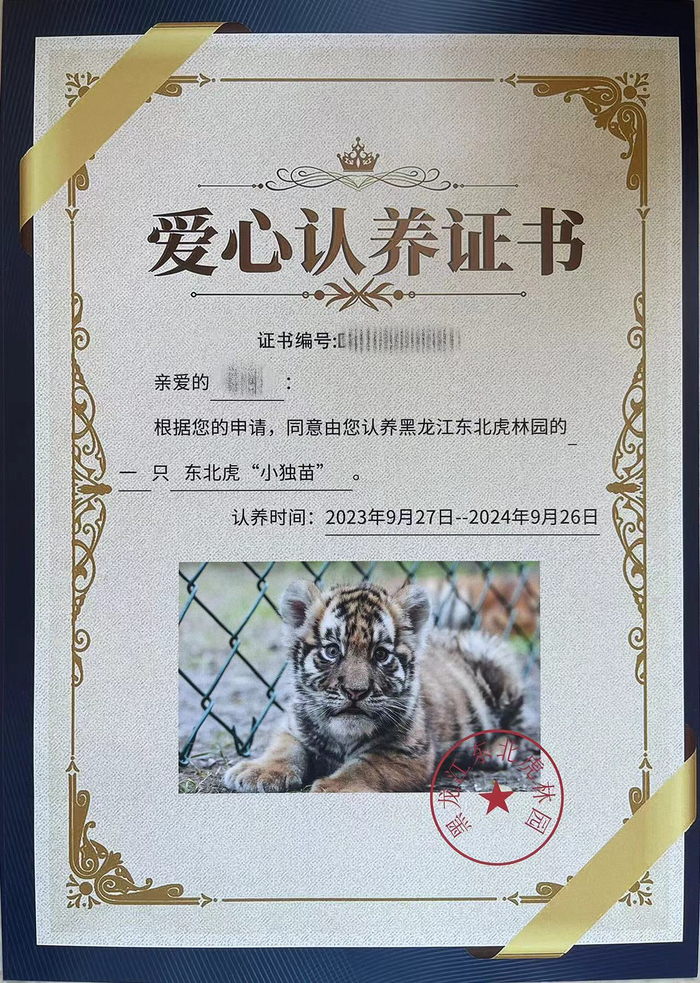 2023年,东北虎“小独苗”在黑龙江东北虎林园降生,同年9月,虎林园正式开放小独苗的认养通道。“第一次在网上看到‘小独苗’的认养消息,自己就被这只幼虎所吸引,便决心认养。”李女士回忆,当时认养时,工作人员推荐了588元/年和1688元/年两个联合认养档位。