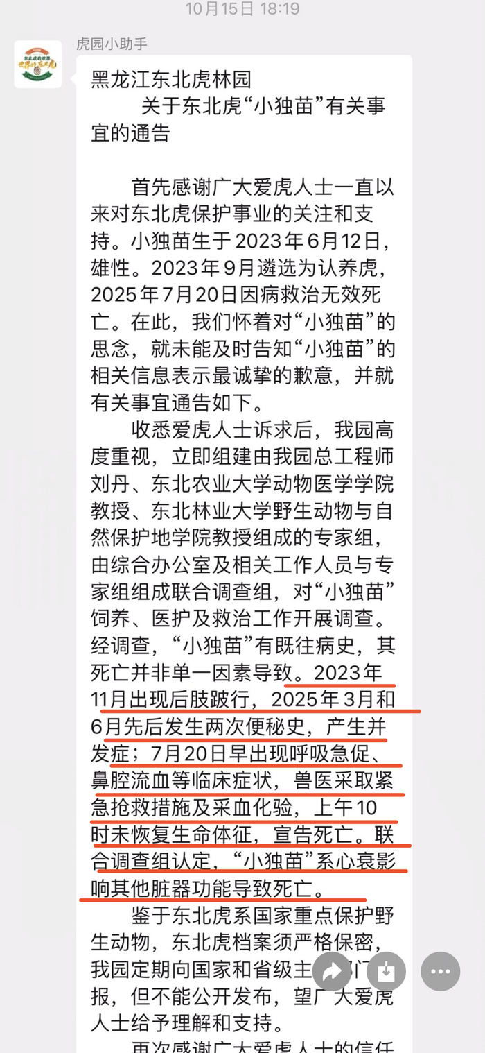 对于认养两年的虎只突然离世,李女士难以接受。“此前,通过虎林园的直播可以看到,‘小独苗’状态很好体格也较为壮实,且虎园一直声称虎只除儿时崴过脚,并无其他疾病。”10月15日,在李女士持续投诉后,黑龙江东北虎林园在官方群发布通告,通告提到,经过联合调查组调查,“小独苗”有既往病史,其死亡并非单一因素导致,2023年11月出现后肢跛行,2025年3月与6月出现两次便秘,产生并发症,7月20日出现呼吸急促、鼻腔流血等临床症状,后无生命体征,最终认定为系心衰影响其他脏器功能导致死亡。