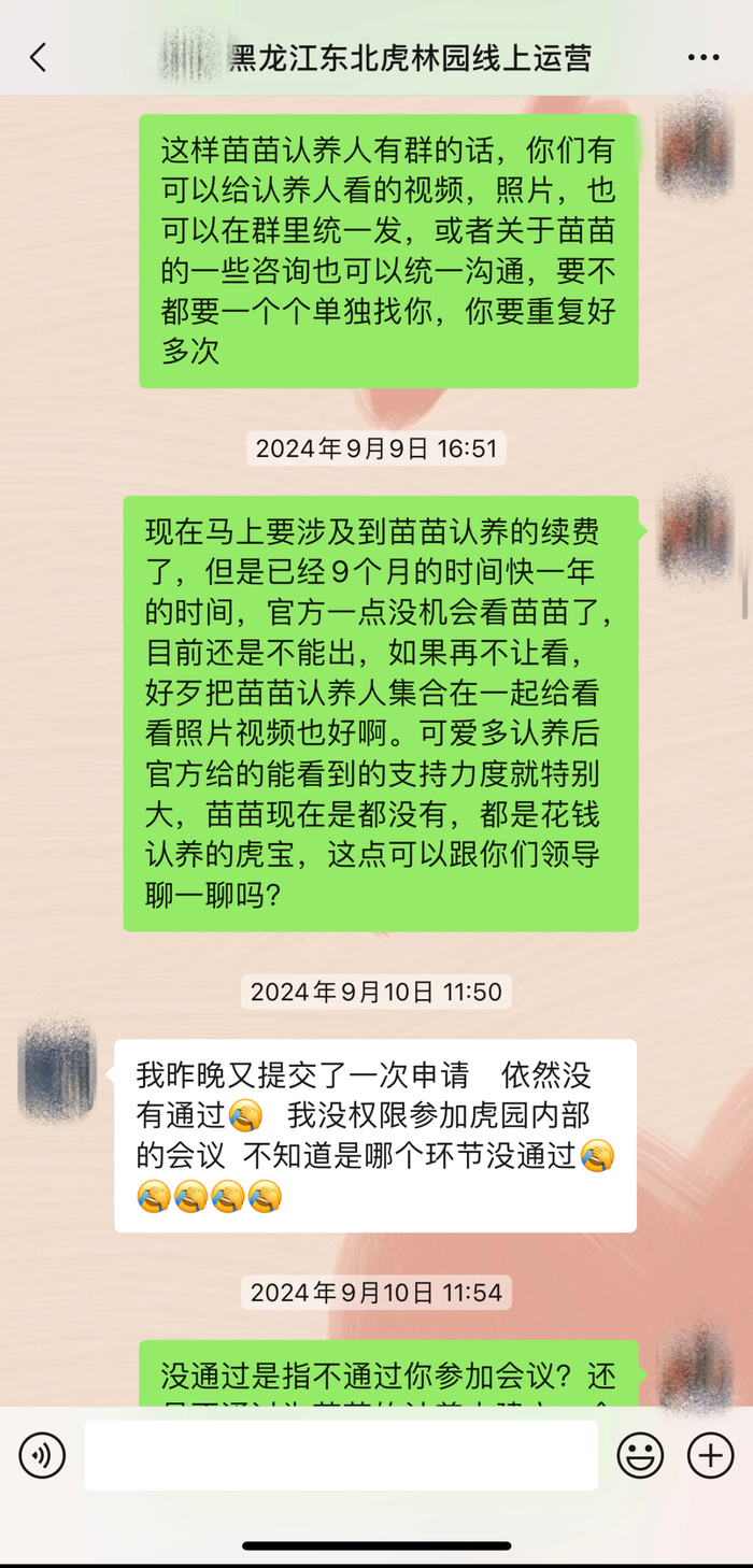 同样作为东北虎爱好者的宋女士也遇到过类似情况。“我从2025年初,独立认养了2只东北虎,认养费每年高达10000元/只。”宋女士告诉记者,认养前,园方承诺将不定期向认养人反馈认养虎只情况,认养所缴纳的费用属于爱心捐赠,会优先用于东北虎的饲养和改善伙食和生活,但认养已半年多,从未主动收到过园方的任何回馈。