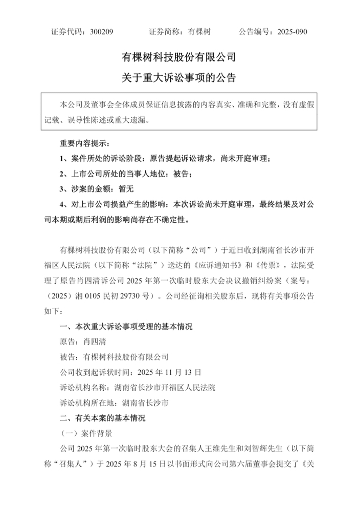 根据公告,有棵树于2025年11月13日收到湖南省长沙市开福区人民法院送达的《应诉通知书》和《传票》。原告为公司股东、前董事长肖四清,其就公司2025年第一次临时股东大会决议提起诉讼,请求法院撤销该决议,并要求公司承担案件受理费、保全费等全部诉讼费用。