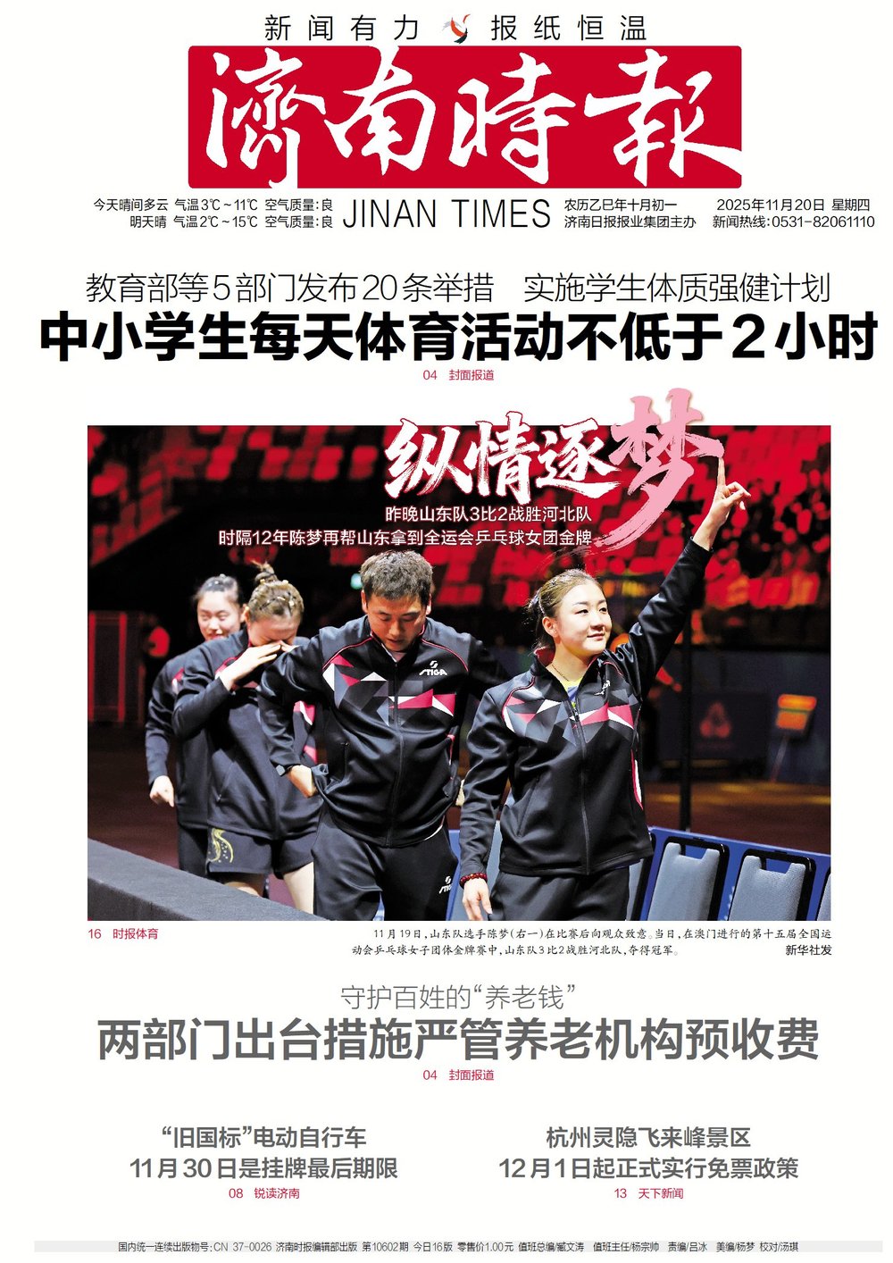 11月19日晚,第十五届全国运动会女子排球成年组决赛在澳门威尼斯人综艺馆圆满落幕。本届赛事中一路高歌猛进的山东女排,在决赛中迎战坐拥9名国手的江苏女排,最终虽憾负对手斩获银牌,却创下山东女排成年队全运会60年来最佳战绩。值得关注的是,济南市培养输送的王梦洁、孙杰、王文涵、解盛钰、宋立琪、解盛岩6名运动员悉数入选山东队阵容,占据半壁江山,她们以精湛技艺和顽强拼搏,成为山东女排实现历史性突破的核心力量。详情>>