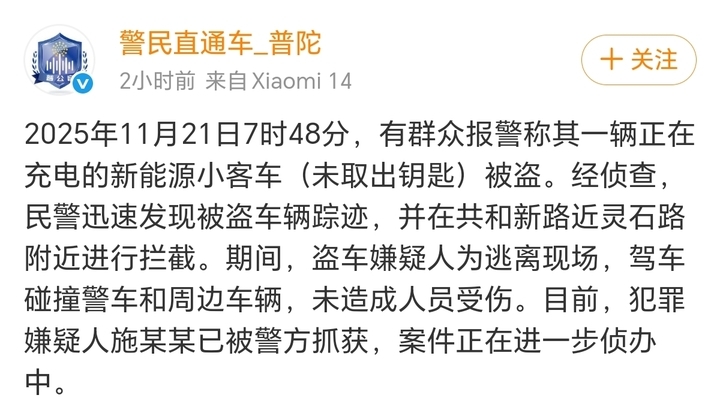 12时15分,上海市公安局普陀分局发布了关于此事的《警情通报》:2025年11月21日7时48分,有群众报警称其一辆正在充电的新能源小客车(未取出钥匙)被盗。经侦查,民警迅速发现被盗车辆踪迹,并在共和新路近灵石路附近进行拦截。其间,盗车嫌疑人为逃离现场,驾车碰撞警车和周边车辆,未造成人员受伤。目前,犯罪嫌疑人施某某已被警方抓获,案件正在进一步侦办中。