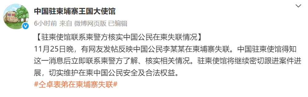 11月26日凌晨,我驻柬使馆发消息称,已联系柬警方核实中国公民在柬失联情况: