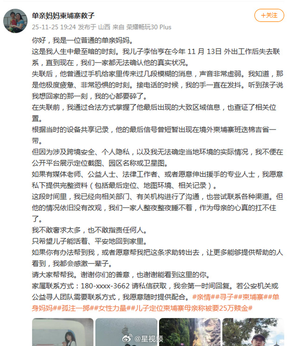 据@单亲妈妈柬埔寨救子 发布的信息显示,其儿子李怡亨最后信号曾短暂出现在境外柬埔寨班迭棉吉省一带,“失联后,他曾通过手机给家里传来过几段模糊的消息,声音非常虚弱。”“直到现在,我们一家都无法确认他的真实状况。”