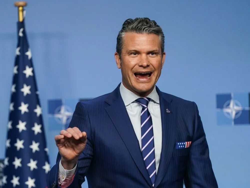 10月15日,在比利时布鲁塞尔,美国国防部长赫格塞思在记者会上发言。新华社记者彭子洋摄