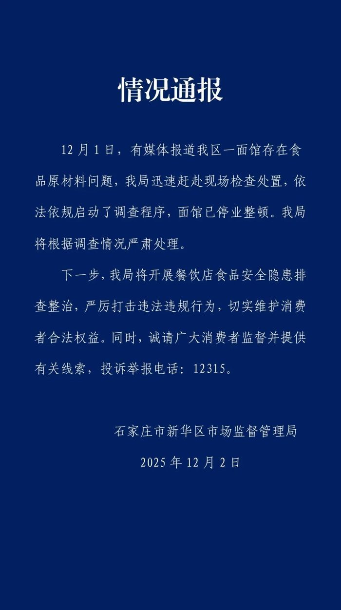 12月2日,石家庄市新华区市场监督管理局发布通报:12月1日,有媒体报道我区一面馆存在食品原材料问题,我局迅速赶赴现场检查处置,依法依规启动了调查程序,面馆已停业整顿。我局将根据调查情况严肃处理。