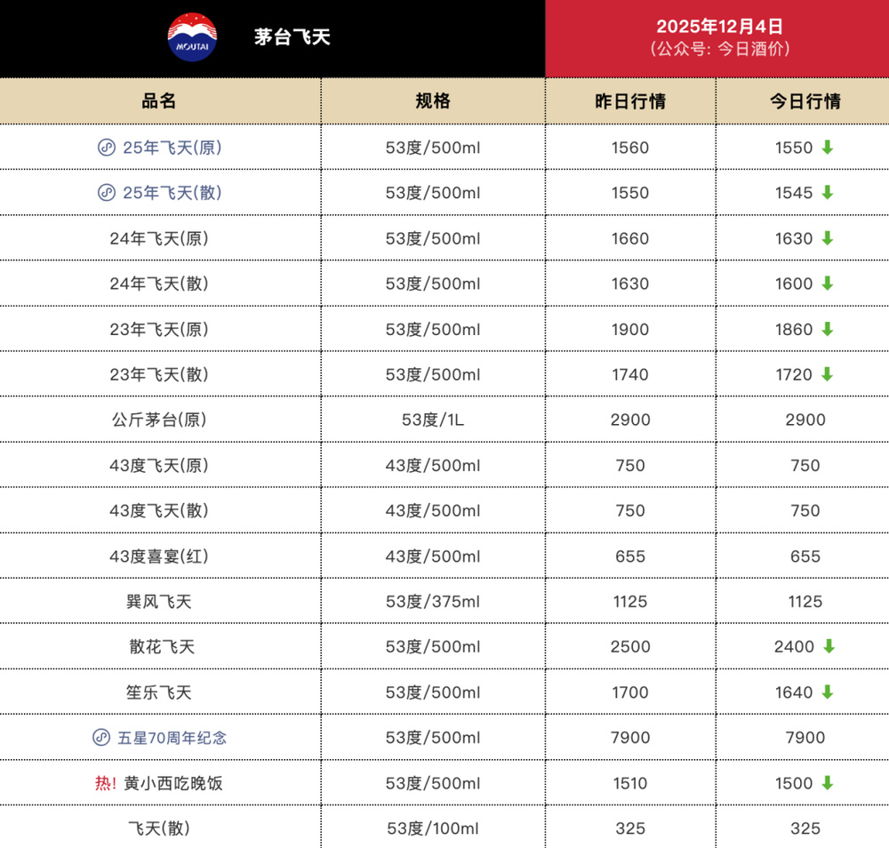 +订阅今日酒价披露的批发参考价显示,12月4日,2025年飞天茅台原箱较前一日下跌10元,报1550元/瓶;2025年飞天茅台散瓶较前一日下跌5元,报1545元/瓶。2024年飞天茅台原箱较前一日下跌30元,报1630元/瓶;2024年飞天茅台散瓶较前一日下跌30元,报1600元/瓶。2023年飞天茅台原箱较前一日下跌40元,报1860元/瓶;2023年飞天茅台散瓶较前一日下跌20元,报1720元/瓶。
