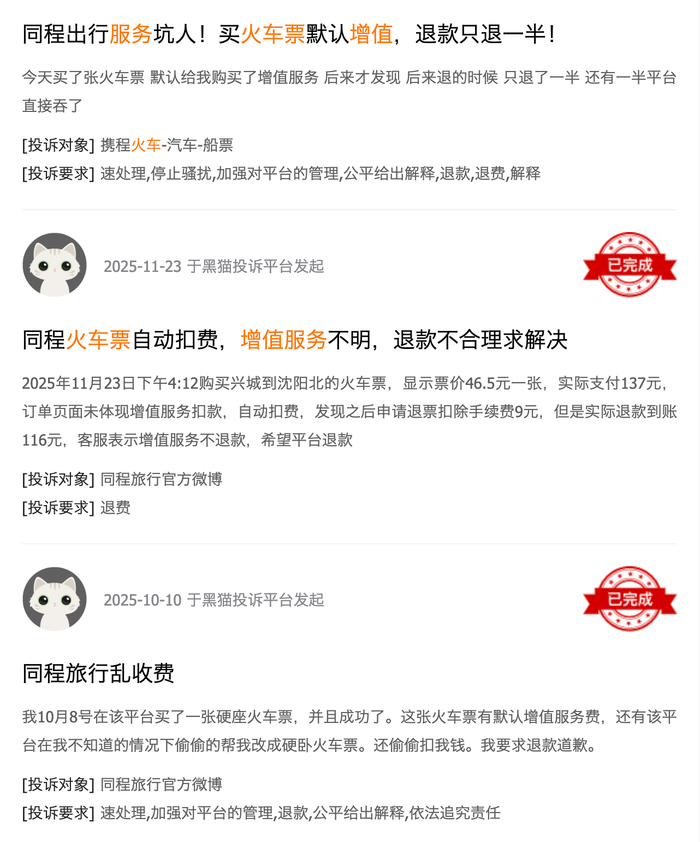 第三方抢票软件近年出现了越来越多的购票“陷阱”,也不断引发着消费者们的“吐槽”和投诉。在黑猫投诉平台,搜索捆绑销售、机票、火车票等关键词,出现了大量投诉内容。其中涉及“增值服务”投诉多达19650条。大部分投诉要求为退款,处理结果也均显示已完成退款。