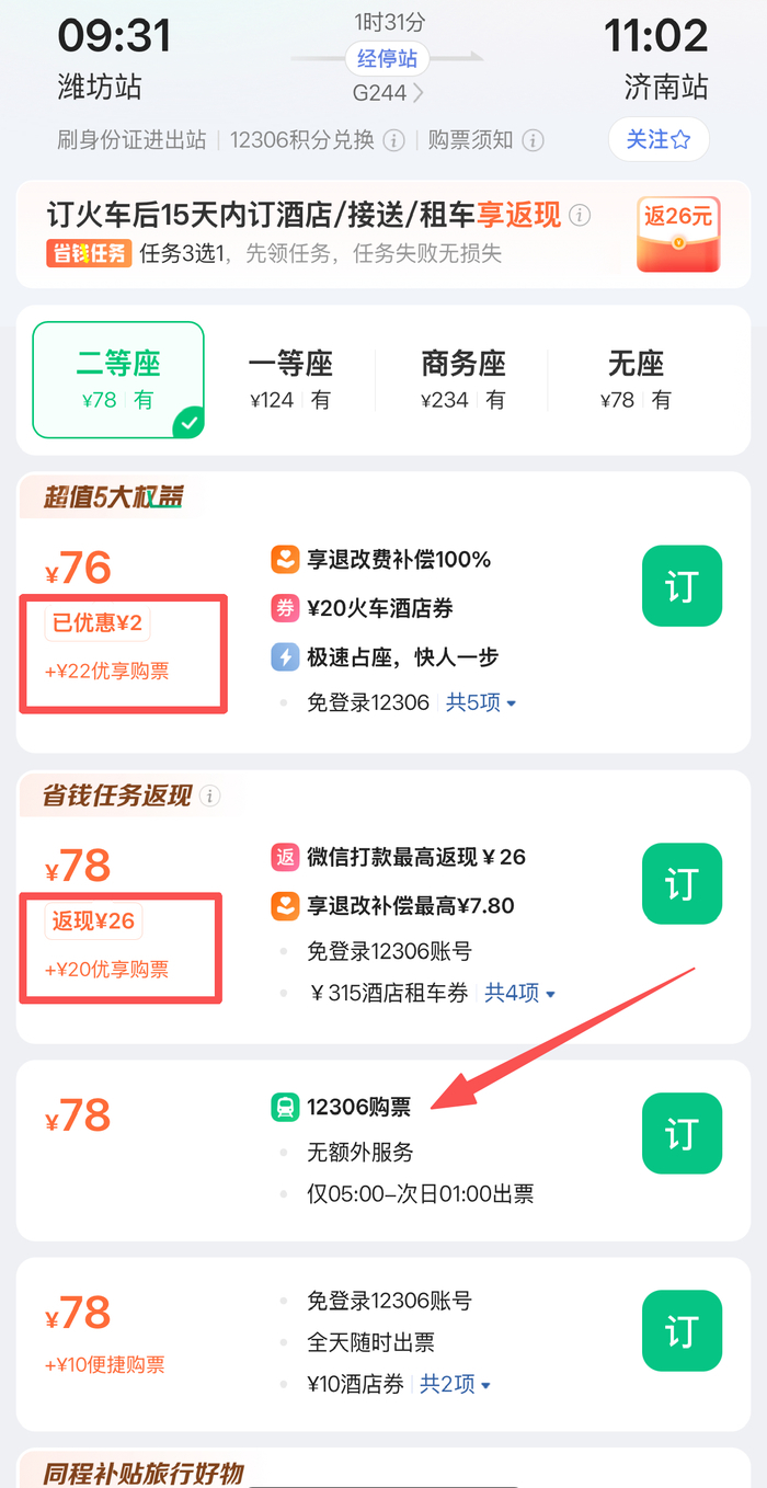 4日,新黄河记者实测以购买济南前往潍坊的G244次车票为例,在“同程旅行”小程序里选择相应车次后,第一位首先显示的二等座优惠价为76元,第二位及以后选项显示该车次的二等座正价是78元。