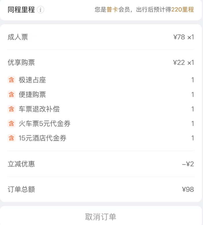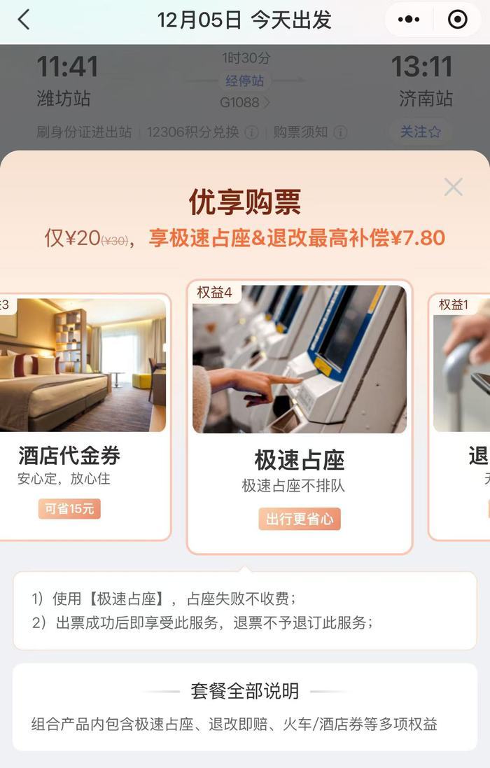 一旦点击购票,“同程旅行”就会为订票用户开通“优享购票”5项增值服务,其中包括退改即赔服务、免登陆购票、火车票代金券、酒店代金券、极速占座等权益,实际支付价格达到了98元。若不选择开通增值服务,消费者需要点击排位靠后的12306购票预订按钮进行购票。