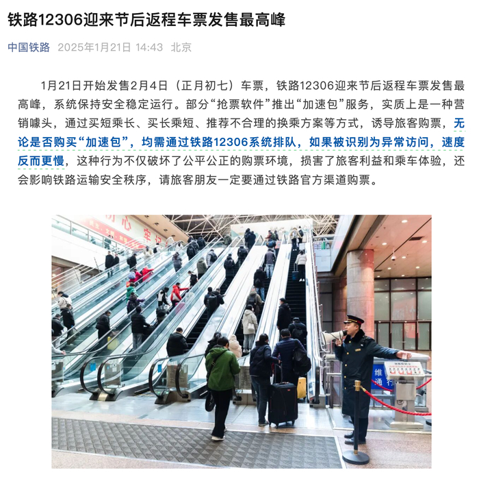 据悉,12306官方曾多次对外强调,消费者在抢票软件上购买的付费加速包,并不能使自己享有优先购票权,无论是否购买“加速包”,均需通过铁路12306系统排队,并表示部分“抢票软件”推出“加速包”服务,实质上是一种营销噱头,通过买短乘长、买长乘短、推荐不合理的换乘方案等方式,诱导旅客购票,如果被识别为异常访问,速度反而更慢,这种行为不仅破坏了公平公正的购票环境,损害了旅客利益和乘车体验,还会影响铁路运输安全秩序,请旅客朋友一定要通过铁路官方渠道购票。