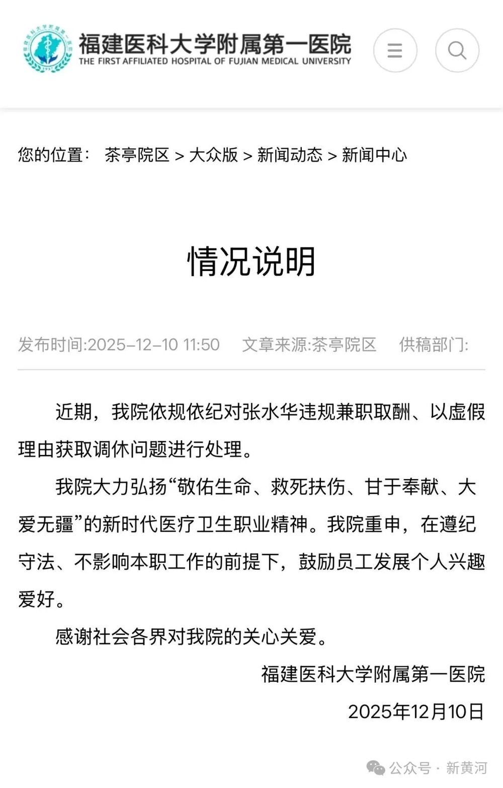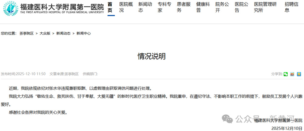 12月10日,福建医科大学附属第一医院官网发布情况通报:近期,我院依规依纪对张水华违规兼职取酬、以虚假理由获取调休问题进行处理。