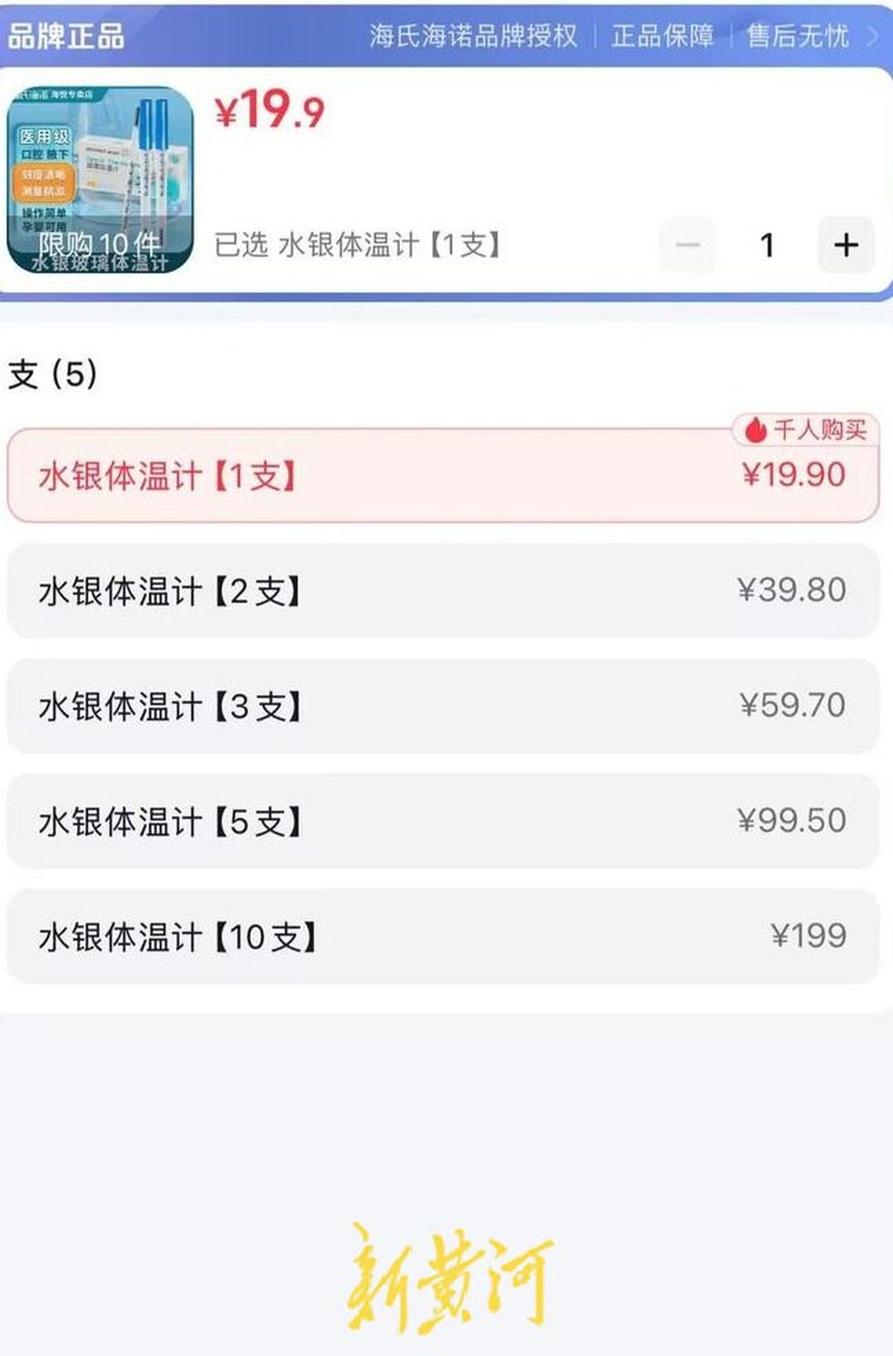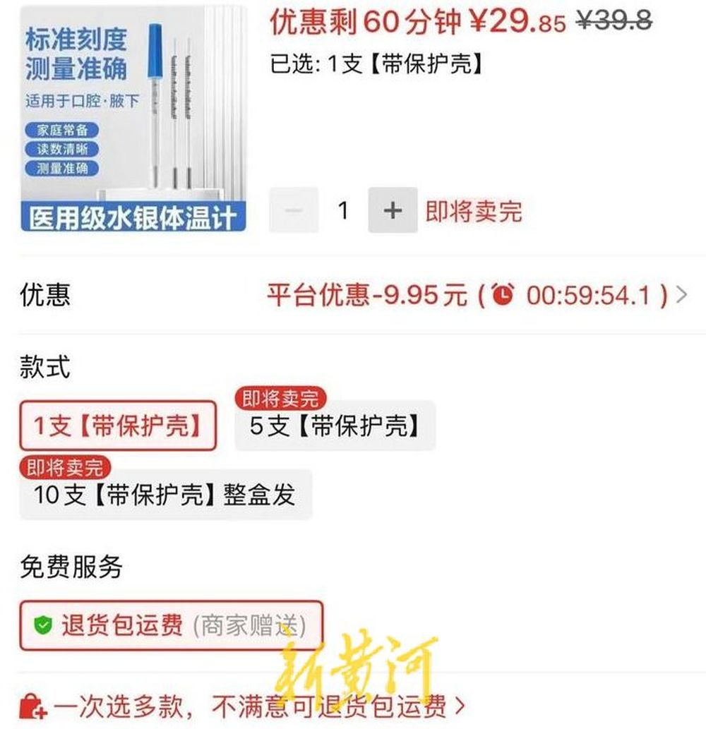 在各大电商平台,多数商家的水银体温计为断货状态,药店卖6元左右的水银体温计,有的线上价格已经卖到了20-30元一支。还有的商家开直播进行水银体温计的售卖,在商品详情中显示已卖了近8万支。一名线上药店的客服表示,当前主推的“无汞玻璃体温计”是采用镓、铟、锡液态合金作为核心材料,无挥发性,相比水银体温计,泄漏后无健康危害。同样具有较高的精确度,感温液柱通常为亮银色,更易观察读数。