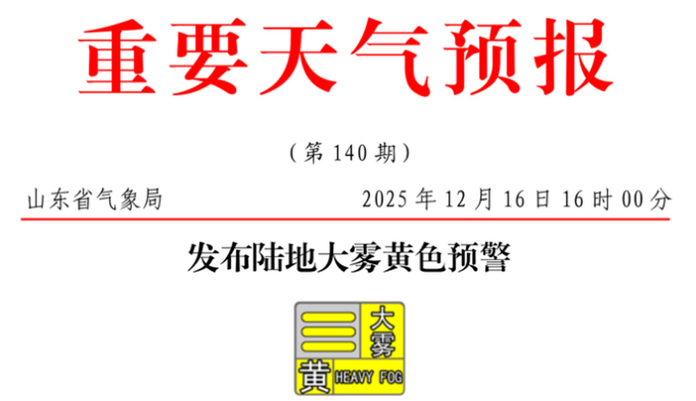 山东省气象台于12月16日16时发布陆地大雾黄色预警:预计16日夜间到17日早晨,菏泽、济宁、枣庄、聊城、德州、滨州、东营、济南、泰安、淄博和潍坊将出现能见度低于500米的浓雾,局部地区能见度不足50米。详情>>