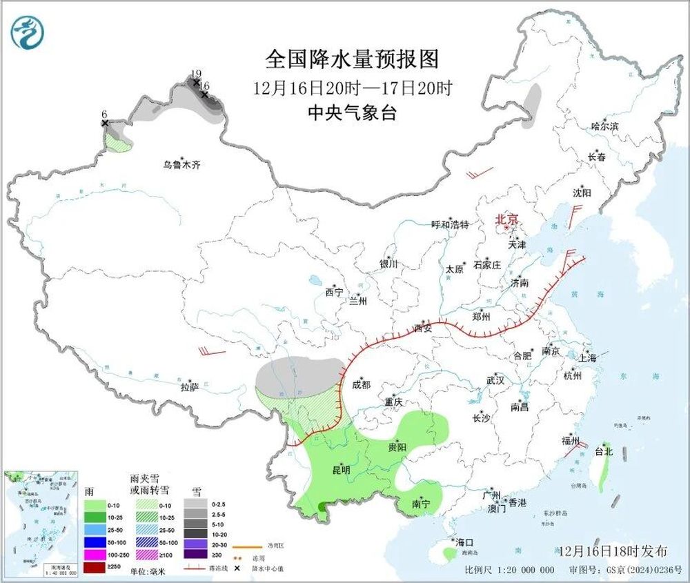 ●16日20时至17日20时,新疆北疆北部、内蒙古东北部、西藏东部、川西高原等地部分地区有小到中雪或雨夹雪,其中,新疆阿勒泰及伊犁河谷有大雪,局地有暴雪。西南地区南部、广西西南部、海南岛、台湾岛等地部分地区有小到中雨。