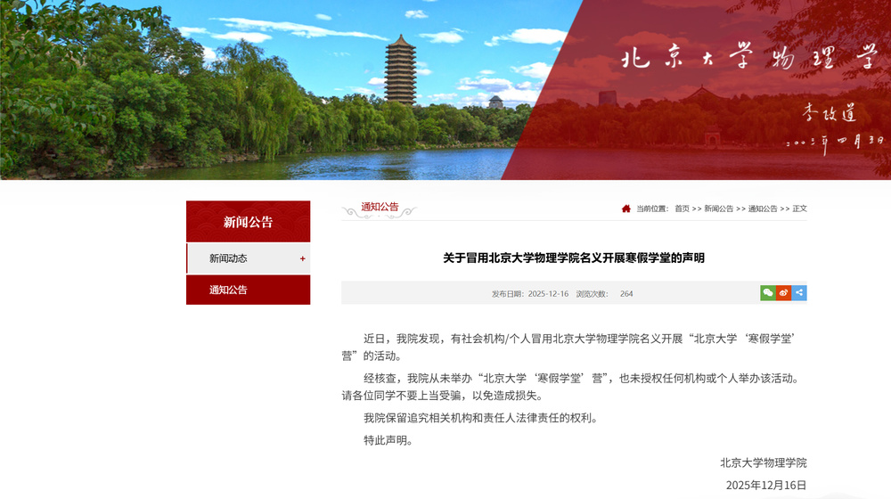 北大物理学院:从未举办“北京大学‘寒假学堂’营”