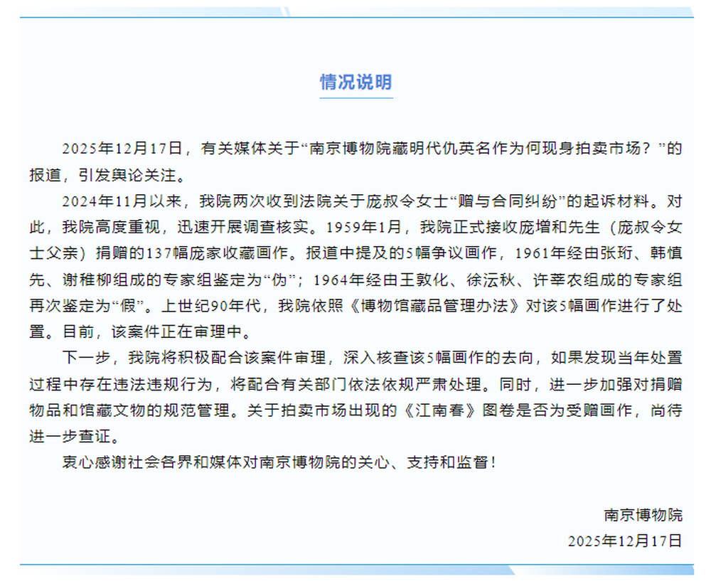 2025年12月17日,有关媒体关于“南京博物院藏明代仇英名作为何现身拍卖市场?”的报道,引发舆论关注。