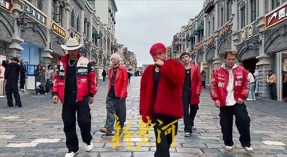 “蹦山咔拉咔”组合在昭通古镇跳舞的视频截图。