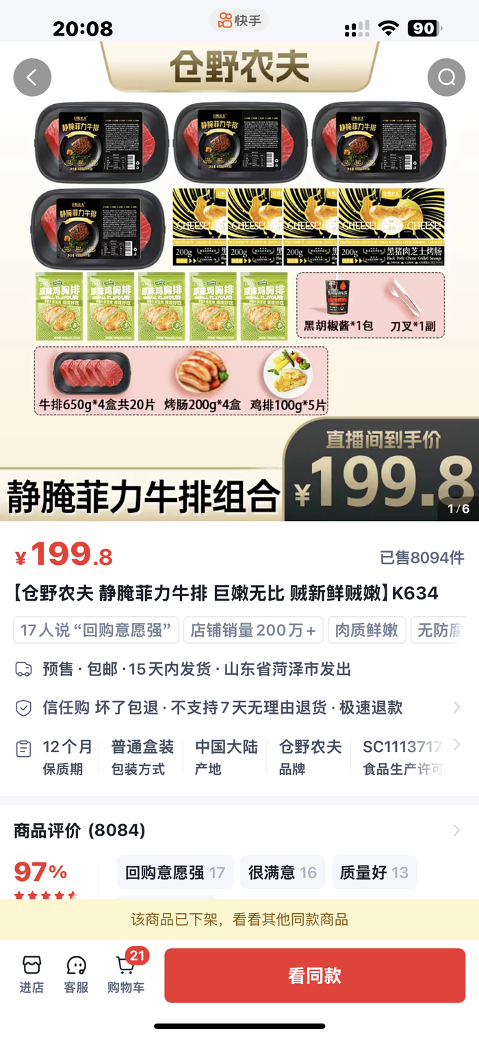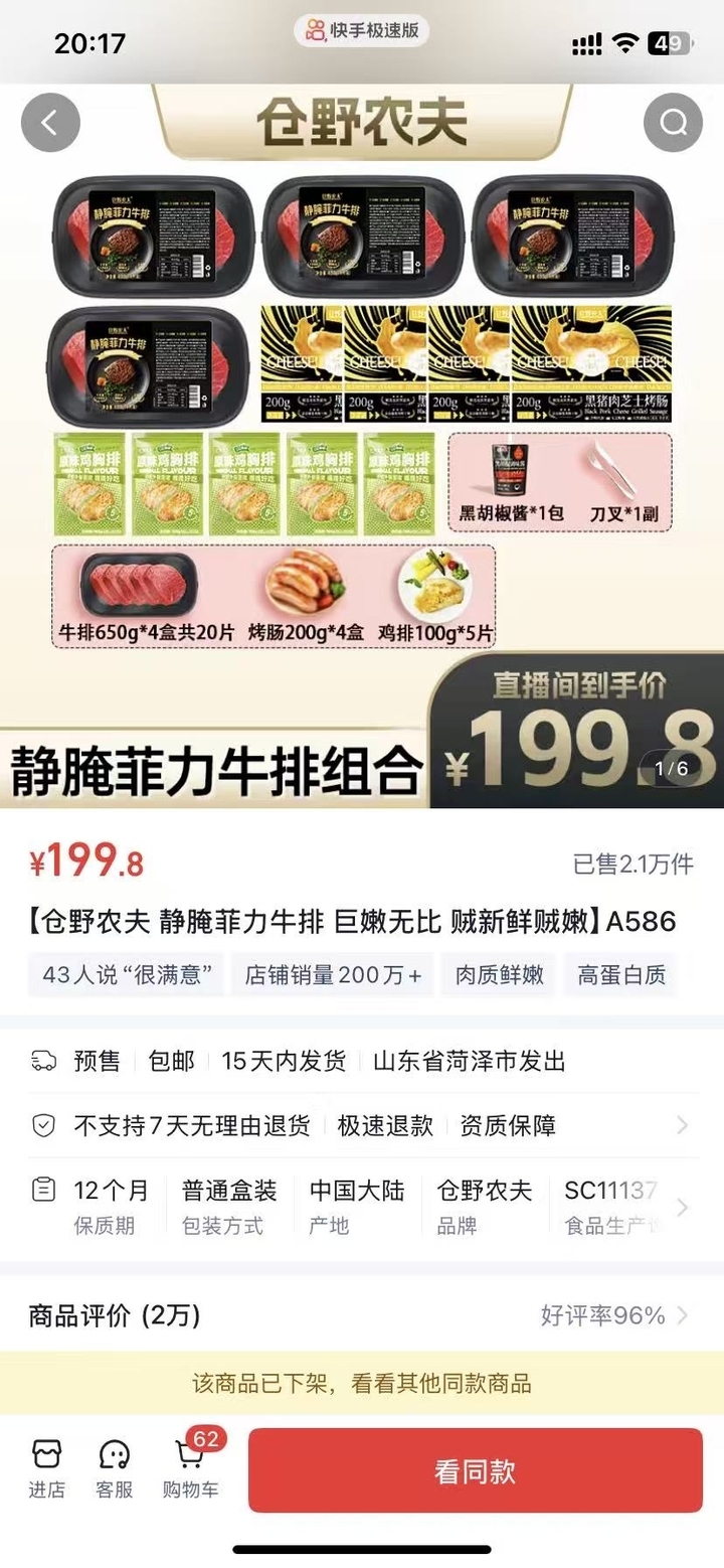 这意味着,仅统计这部分可见数据,该款涉事牛排的累计销量就已超过6.5万单。按照约199.8元的直播间单价计算,实际销售总额高达1300万元。这一数字,是行政处罚决定书中认定“违法货值”78.9万元的16倍之多。