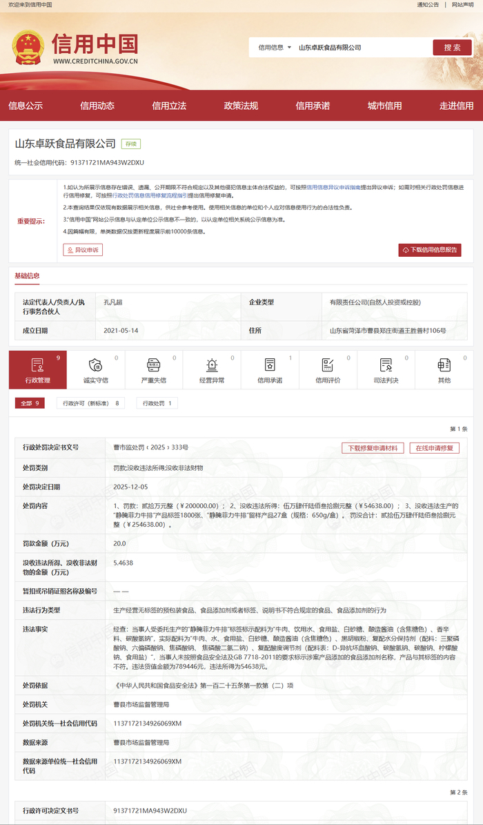 决定书显示,因“生产经营无标签的预包装食品、食品添加剂或者标签、说明书不符合规定”,涉事企业被罚款20万元,没收违法所得5.46万元,合计罚没款项约25.46万元。