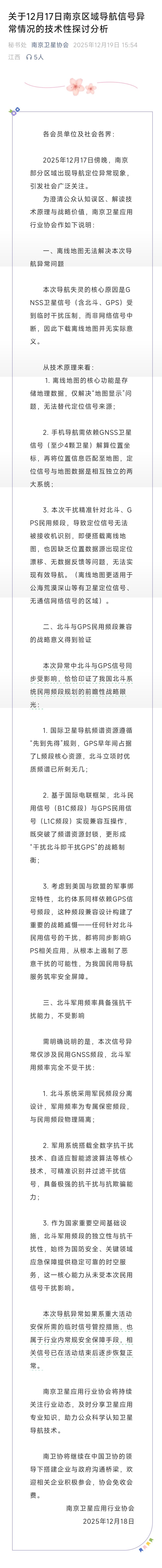 南京卫星协会微信公众号发布关于12月17日南京区域导航信号异常情况的技术性探讨分析,2025年12月17日傍晚,南京部分区域出现导航定位异常现象,本次导航失灵的核心原因是GNSS卫星信号(含北斗、GPS)受到临时干扰压制,而非网络信号中断,因此下载离线地图并无实际意义。