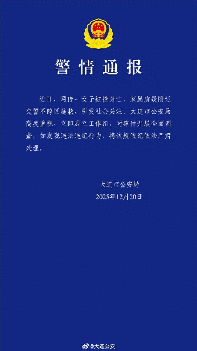近日,网传一女子被撞身亡,家属质疑附近交警不跨区施救,引发社会关注。大连市公安局高度重视,立即成立工作组,对事件开展全面调查,如发现违法违纪行为,将依规依纪依法严肃处理。