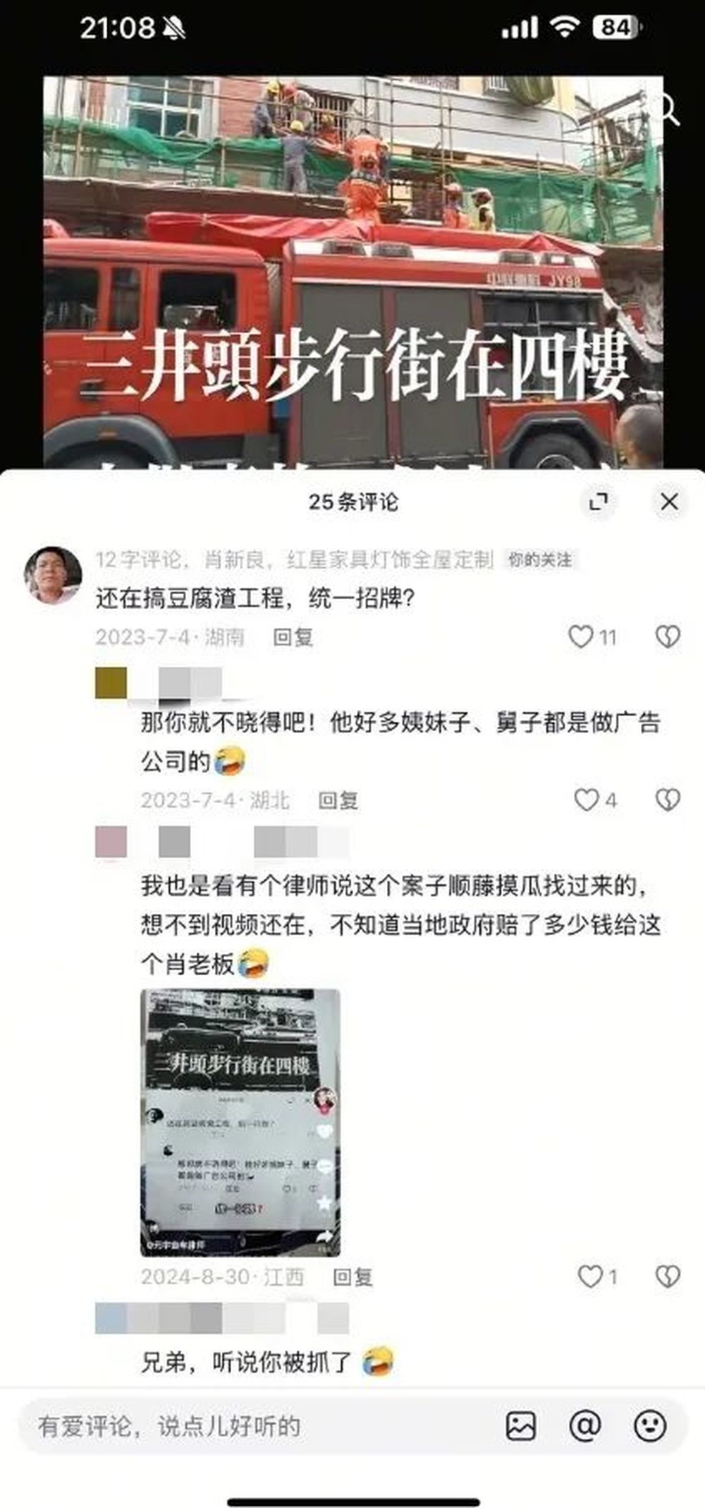 2023年7月4日,和平常一样,肖新良窝在家具店里刷抖音,打发没有客人的时间,一条30秒的短视频吸引了他的注意:消防车闪着灯停在一栋楼房前,救援人员正在脚手架上忙碌。视频字幕写着:“三井头步行街在四楼上做事的一个人,滴到二楼的一个做事的人身上两人一起受了。”
