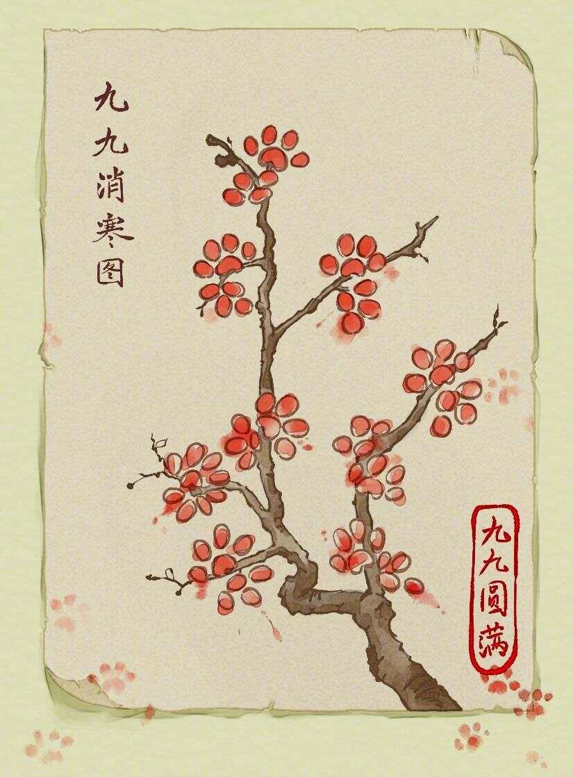 “画九”,以梅花图最为经典,以前尤其受到闺阁女子的喜爱。“冬至后,贴梅花一枝于窗间,佳人晓妆,日以胭脂涂一圈,八十一圈既足,变作杏花,即回暖矣。”方云提到,元代杨允孚《滦京杂咏》写过“试数窗间九九图,余寒消尽暖回初。梅花点遍无余白,看到今朝是杏株”的诗句,将每天晨起梳妆的佳人与“由梅而杏、由冬而春”的季节转换相联,“佳人每天画上一笔,寒冬就在这日复一日的点染中悄然过渡为暖春”。