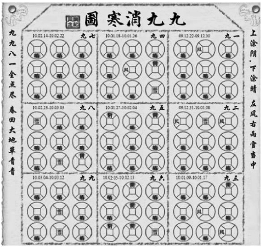 铜钱型消寒图的涂抹位置与圆圈型的一样。人们把涂抹的规则编成了一首民谣,歌词为:“上阴下晴雪当中,左风右雨要分清。九九八一全点尽,春回大地草青青。”