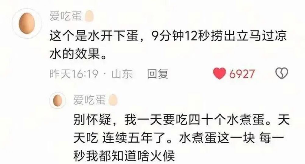 有网友追问溏心蛋怎么做,他秒回7分11秒;有人煮蛋翻车,他一眼看穿“水没淹过蛋”。为了回应网友们的诸多问题,博主“爱吃蛋”连夜录制了一条煮蛋视频,完整直观地让网友们看到了不同时长的水煮蛋呈现出的不同效果。