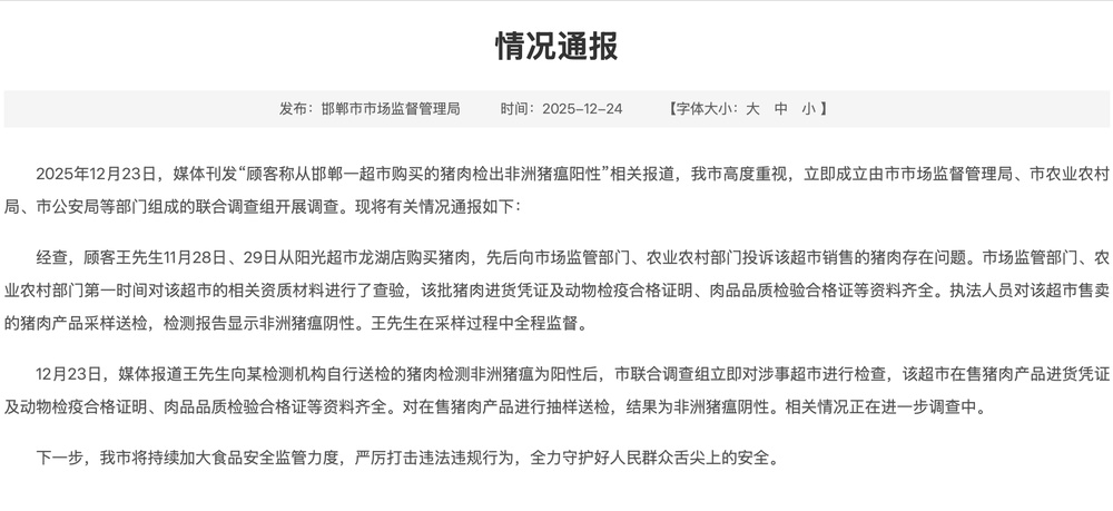 2025年12月23日,媒体刊发“顾客称从邯郸一超市购买的猪肉检出非洲猪瘟阳性”相关报道,我市高度重视,立即成立由市市场监督管理局、市农业农村局、市公安局等部门组成的联合调查组开展调查。现将有关情况通报如下: