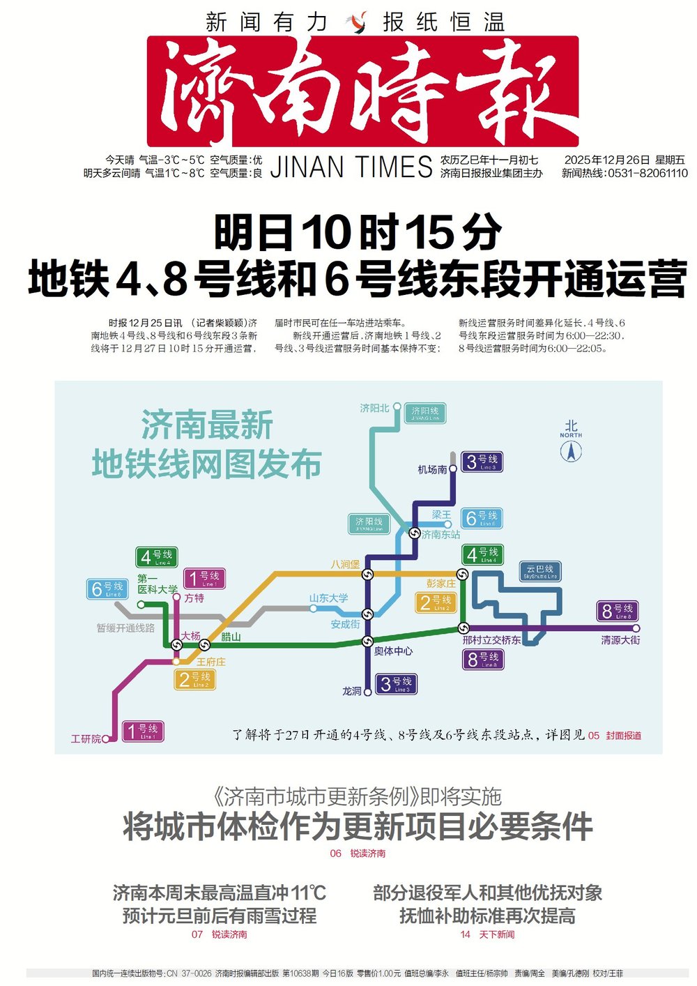 济南地铁4、8号线和6号线东段将于12月27日10时15分开通运营。届时市民可在任一车站进站乘车。