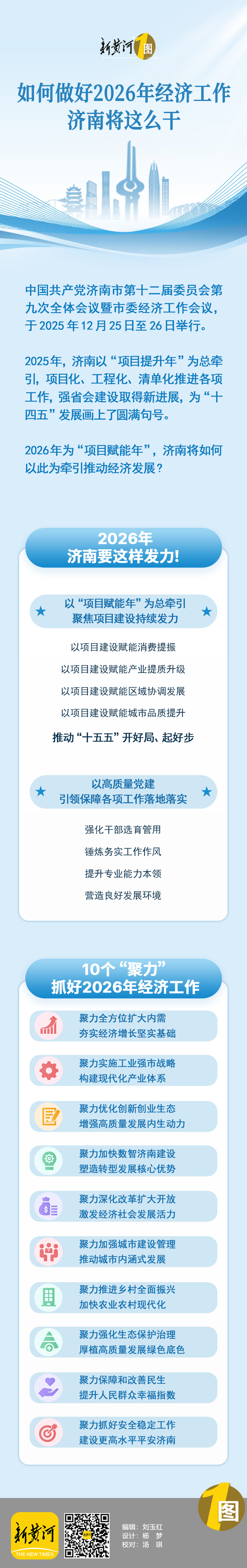 中国共产党济南市第十二届委员会第九次全体会议暨市委经济工作会议,于2025年12月25日至26日举行。如何做好2026年经济工作?一图读懂↓