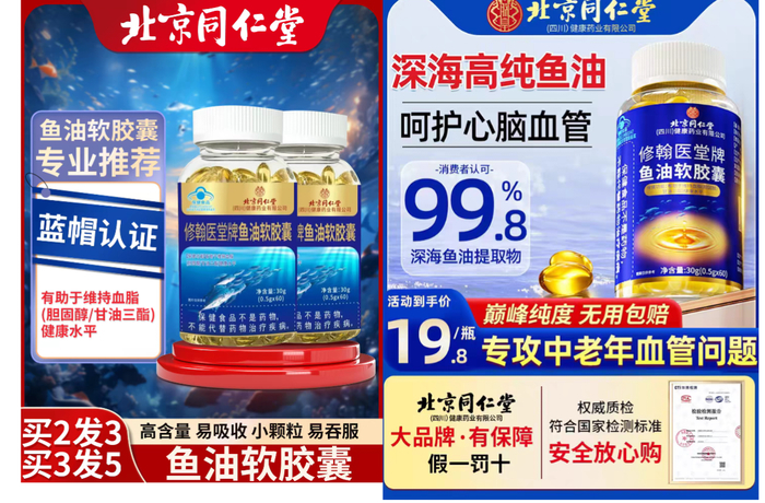 当天,记者以“北京同仁堂磷虾油”为关键词在电商平台搜索发现,前述涉事同款产品确已不再售卖,但类似贴牌的保健食品、医疗器械等品类仍在大肆销售。例如,同一款名为“修翰医堂牌鱼油软胶囊”的产品,在宣传页、瓶盖位置都标有“北京同仁堂(四川)健康药业有限公司”字样,但产品包装和生产企业完全不同,生产企业则同样指向安徽阜阳多家企业。