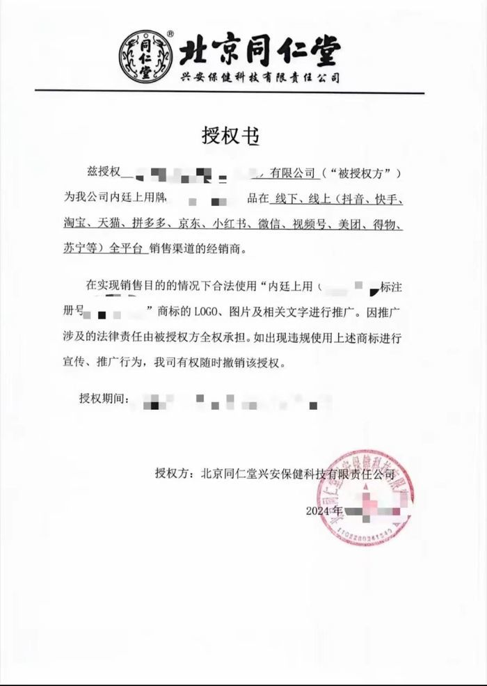 记者在社交媒体上找到了多个经营同仁堂经销授权业务的账号,可能是磷虾油余波未过,对方对经销授权业务都闭口不谈。一个账号称自己是“北京同仁堂一级代理商”,旗下有300多类产品可提供OEM贴牌服务,不需要加盟费。值得一提的是,其还附有多份盖有红章的授权书。