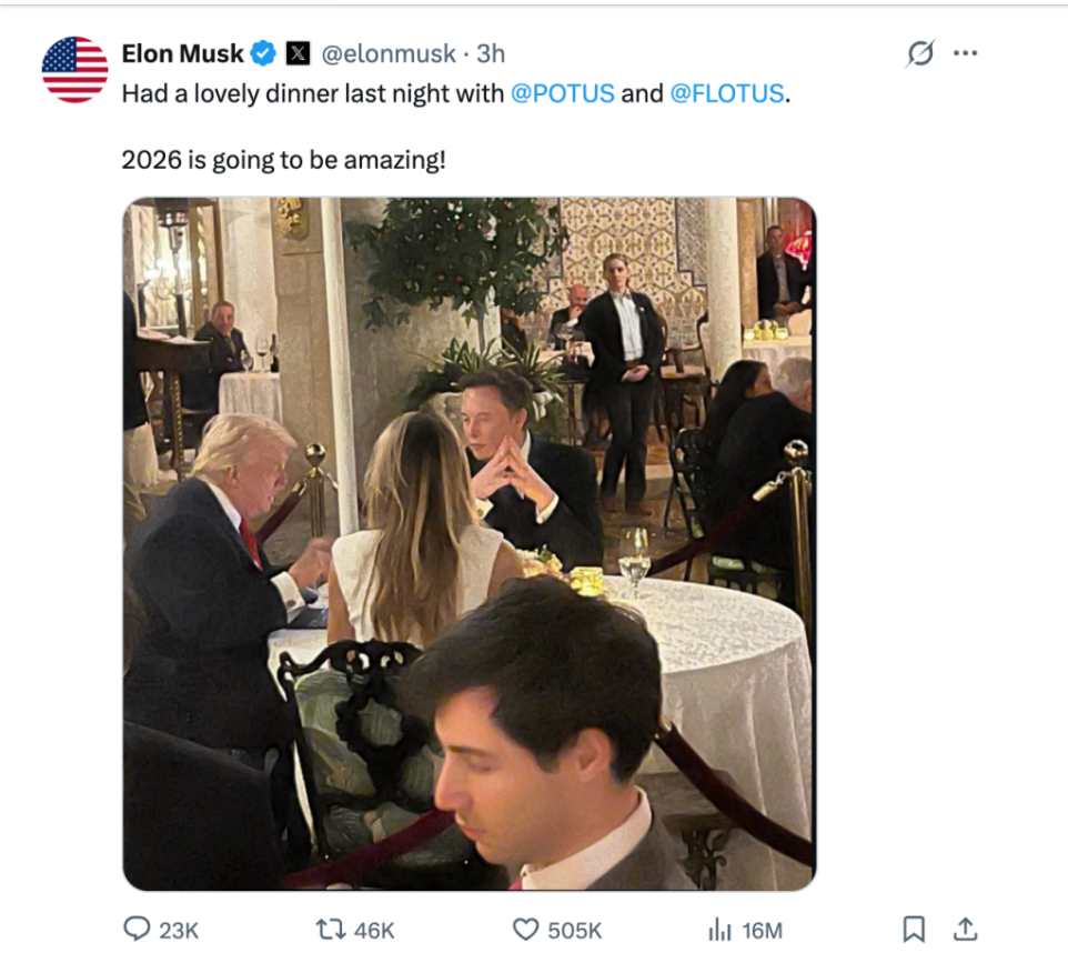 美国企业家埃隆·马斯克当地时间1月4日在社交平台X上发文称,他昨晚(3日)与美国总统特朗普和美国第一夫人梅拉尼娅·特朗普“共进美好晚餐”,并配上一张三人一起用餐的照片。