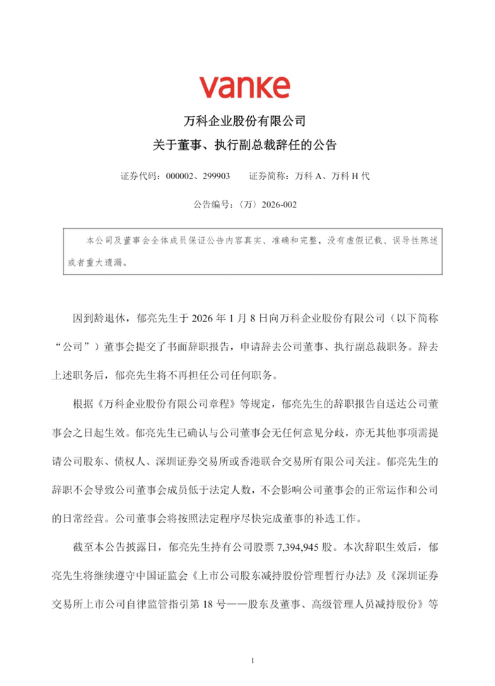 1月8日晚间,万科A(000002)发布公告,因到龄退休,郁亮向公司董事会提交了书面辞职报告,申请辞去公司董事、执行副总裁职务,辞职后将不再担任公司任何职务。郁亮在万科乃至整个地产行业很有资历,因此有人认为这也标志着万科一个时代的落幕。