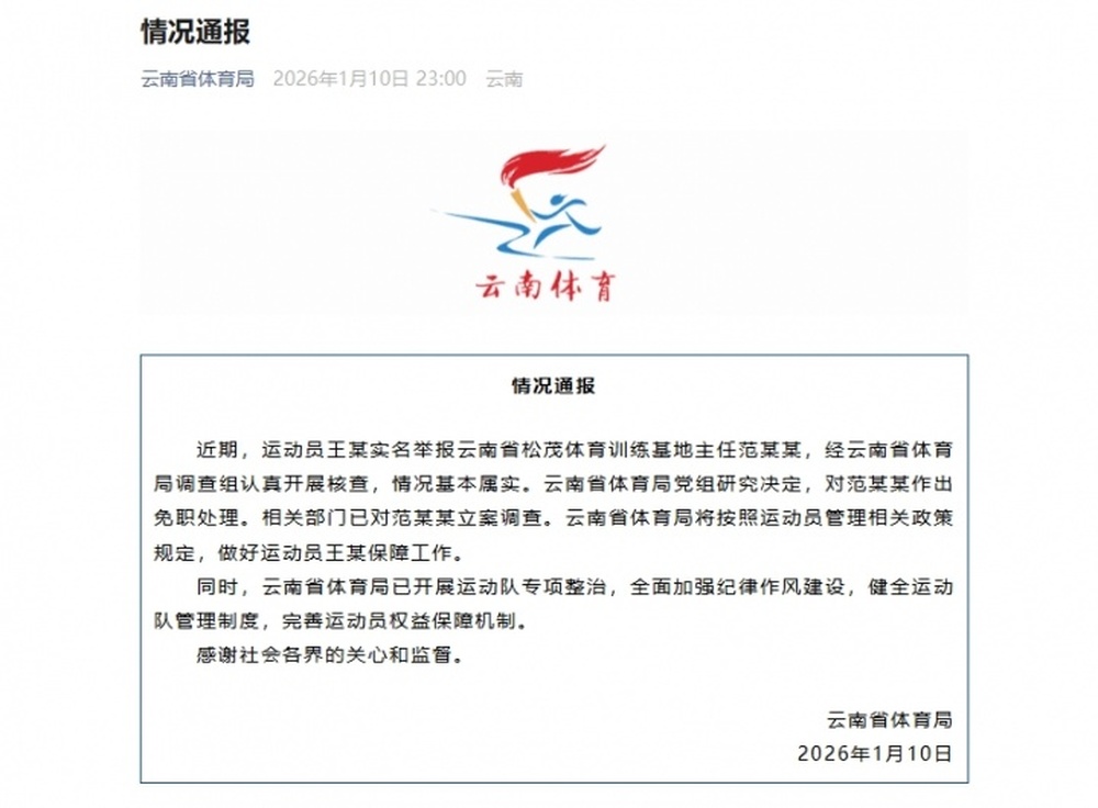 云南省体育局将按照运动员管理相关政策规定,做好运动员王某保障工作。同时,云南省体育局已开展运动队专项整治,全面加强纪律作风建设,健全运动队管理制度,完善运动员权益保障机制。