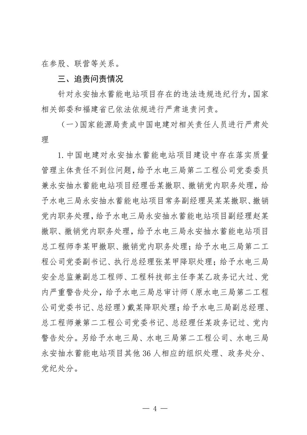 1.中国电建对永安抽水蓄能电站项目建设中存在落实质量管理主体责任不到位问题,给予水电三局第二工程公司党委委员兼永安抽水蓄能电站项目经理岳某撤职、撤销党内职务处理,给予水电三局永安抽水蓄能电站项目常务副经理吴某某撤职、撤销党内职务处理,给予水电三局永安抽水蓄能电站项目副经理赵某撤职、撤销党内职务处理,给予水电三局永安抽水蓄能电站项目总工程师李某甲撤职、撤销党内职务处理;给予水电三局第二工程公司党委副书记、执行总经理张某甲降职处理;给予水电三局安全总监兼副总工程师、工程科技部主任李某乙政务记大过、党内严重警告处分,给予水电三局总审计师(原水电三局第二工程公司党委书记、总经理)戴某降职处理;给予水电三局副总经理、总工程师兼第二工程公司党委书记、总经理任某政务记过、党内警告处分。另给予水电三局、水电三局第二工程公司、水电三局永安抽水蓄能电站项目其他36人相应的组织处理、政务处分、党纪处分。