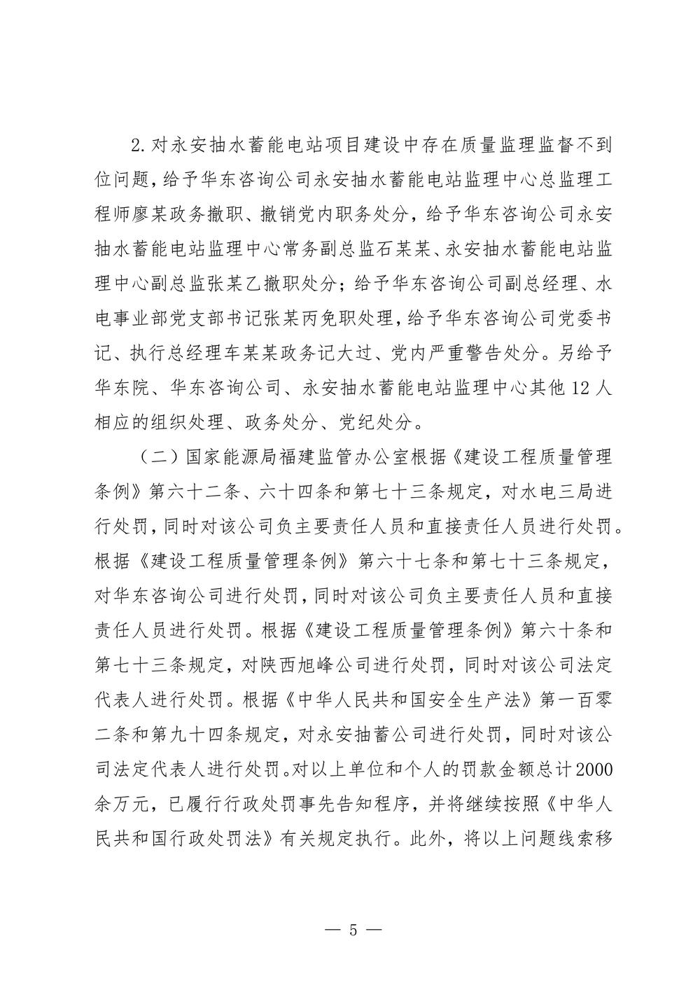 (二)国家能源局福建监管办公室根据《建设工程质量管理条例》第六十二条、六十四条和第七十三条规定,对水电三局进行处罚,同时对该公司负主要责任人员和直接责任人员进行处罚。根据《建设工程质量管理条例》第六十七条和第七十三条规定,对华东咨询公司进行处罚,同时对该公司负主要责任人员和直接责任人员进行处罚。根据《建设工程质量管理条例》第六十条和第七十三条规定,对陕西旭峰公司进行处罚,同时对该公司法定代表人进行处罚。根据《中华人民共和国安全生产法》第一百零二条和第九十四条规定,对永安抽蓄公司进行处罚,同时对该公司法定代表人进行处罚。对以上单位和个人的罚款金额总计2000余万元,已履行行政处罚事先告知程序,并将继续按照《中华人民共和国行政处罚法》有关规定执行。此外,将以上问题线索移交颁发资质证书的机关依法依规处理。