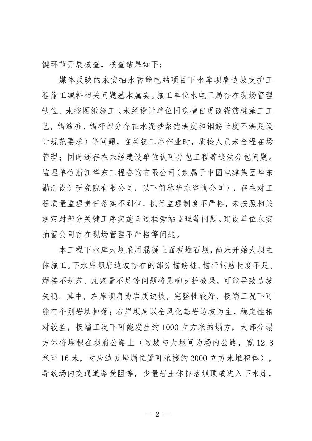 近期,媒体反映福建永安抽水蓄能电站项目存在水库大坝施工偷工减料等问题,国家有关部委和福建省对此高度重视,国家能源局福建监管办公室、福建省能源局等相关部门迅速组成核查工作组,当天立即赶往项目现场,要求现场工程全面停工,并组织专业力量开展现场核查,目前核查工作已完成。情况通报如下: