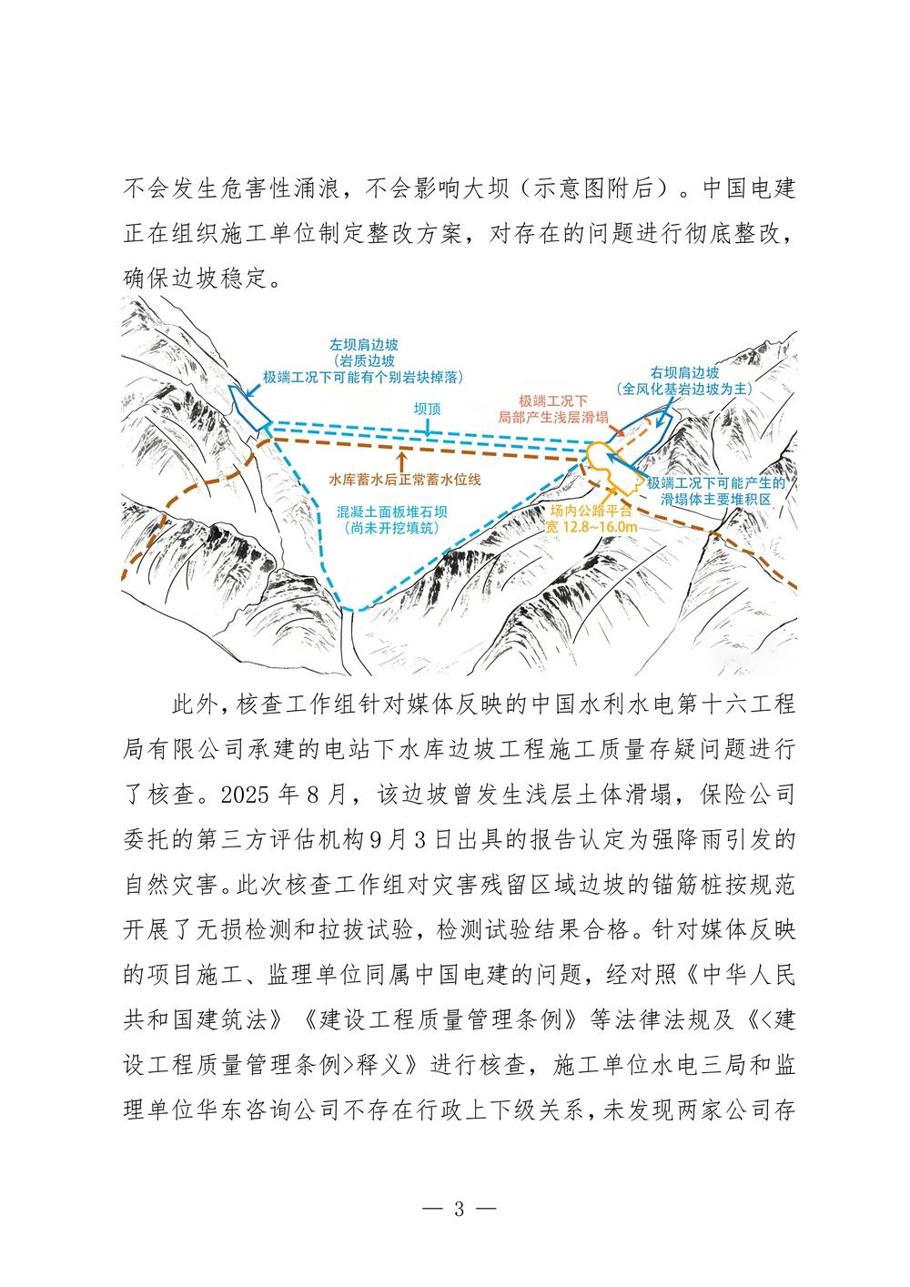 此外,核查工作组针对媒体反映的中国水利水电第十六工程局有限公司承建的电站下水库边坡工程施工质量存疑问题进行了核查。2025年8月,该边坡曾发生浅层土体滑塌,保险公司委托的第三方评估机构9月3日出具的报告认定为强降雨引发的自然灾害。此次核查工作组对灾害残留区域边坡的锚筋桩按规范开展了无损检测和拉拔试验,检测试验结果合格。针对媒体反映的项目施工、监理单位同属中国电建的问题,经对照《中华人民共和国建筑法》《建设工程质量管理条例》等法律法规及《<建设工程质量管理条例>释义》进行核查,施工单位水电三局和监理单位华东咨询公司不存在行政上下级关系,未发现两家公司存在参股、联营等关系。