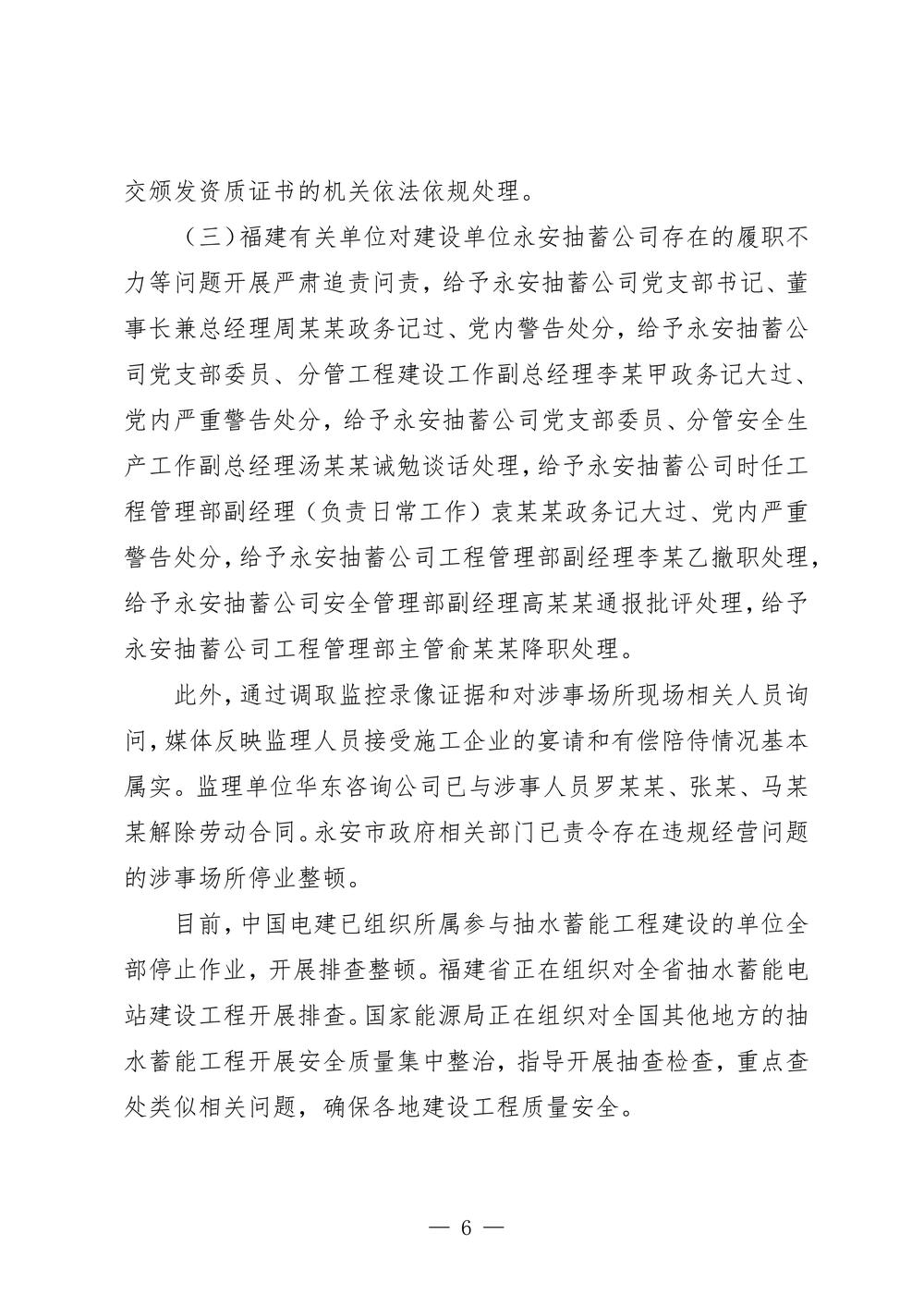 针对永安抽水蓄能电站项目存在的违法违规违纪行为,国家相关部委和福建省已依法依规进行严肃追责问责。
