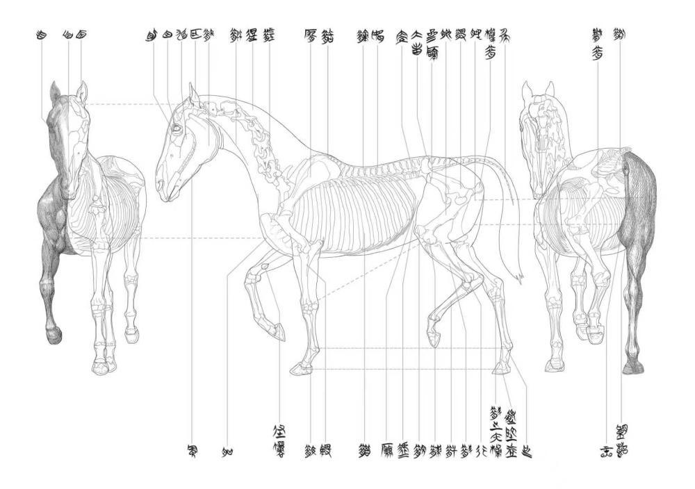 值得一提的是,《胥马》和《凡马之疾》等文献中,有大量马体部位名称。“面对大量前所未见的早期相马、疗马知识,我们在整理过程中面临很大困难。”如何把零散的知识系统、直观呈现?清华大学出土文献研究与保护中心教授贾连翔结合相关传世文献、出土文献、铜马式资料以及现代解剖学等,对所见数十个名称进行考证,绘制出战国马体部位名称推拟图。