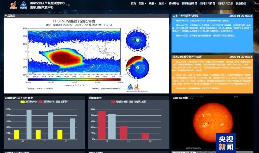 风云三号H星也从太空拍摄到了北半球的极光图,由此可以直观看出哪些区域出现了极光。根据太阳活动情况,中国气象局空间天气监测预警中心对未来一段时间的空间天气情况做出了判断:预计未来三天,太阳活动水平中等,有可能爆发M级以上耀斑;受冕洞和CME共同影响,20日可能出现大地磁暴,21日可能出现小地磁暴,22日地磁活动平静到活跃;受可能发生的地磁暴影响,电离层天气可能出现扰动。
