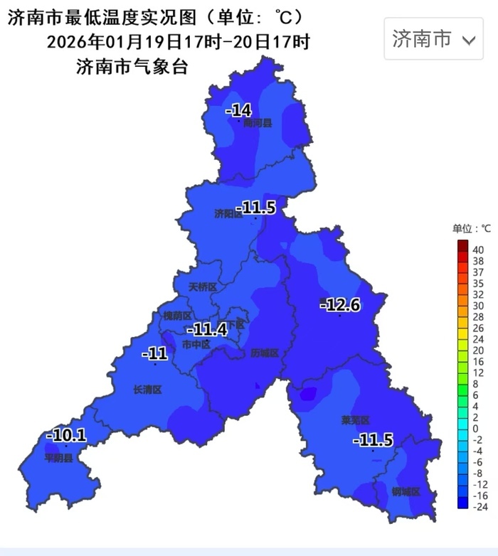 今天(20日)是二十四节气中的大寒,济南的气温让人们直观感受到大寒的威力:今天清晨市区最低气温约-11℃,商河县最低气温低至-14℃。市气象台今天16时继续发布寒潮黄色预警信号。