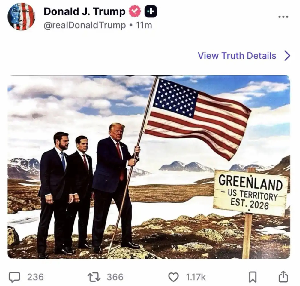 ●当地时间1月20日,美国总统特朗普当天表示,他控制格陵兰岛的目标“绝不会改变”,并拒绝排除以武力夺取格陵兰岛的可能性。特朗普在社交媒体上阐明了他的目的:从北约盟友丹麦手中夺取格陵兰岛的主权。